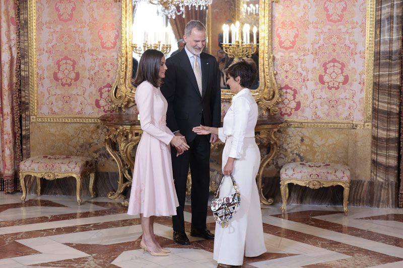 Antes de que diera comienzo el almuerzo, los Reyes han saludado a sus invitados, entre los que se encontraban autoridades, editores, libreros, escritores, periodistas especializados y miembros del mundo de la cultura como los escritores Soledad Puértolas, Juan Gómez Jurado, Juan Pedro Aparicio, Ernesto Pérez Zúñiga, entre otros. También han destacado el cómico y presentador Ángel Martín, María de los Ángeles García García, más conocida como Boticaria García, y Sonsoles Ónega, ganadora del Premio Planeta por su novela Las hijas de la criada. La Reina y la también presentadora son grandes amigas y el pasado noviembre, doña Letizia la sorprendió acudiendo a una firma de libros donde aguantó 40 minutos de cola. La reacción de Sonsoles fue de sorpresa total y las dos se fundieron en un efusivo abrazo. Para esta cita, La reina Letizia ha llevado un vestido de manga larga con gran vuelo en la falda en tono rosa empolvado con aplicaciones florales que firma Nacho Aguayo para Pedro del Hierro, mientras que la periodista se ha decantado por un total look blanco formado por blusa y pantalones que ha complementado con un bolso estampado de Dior.