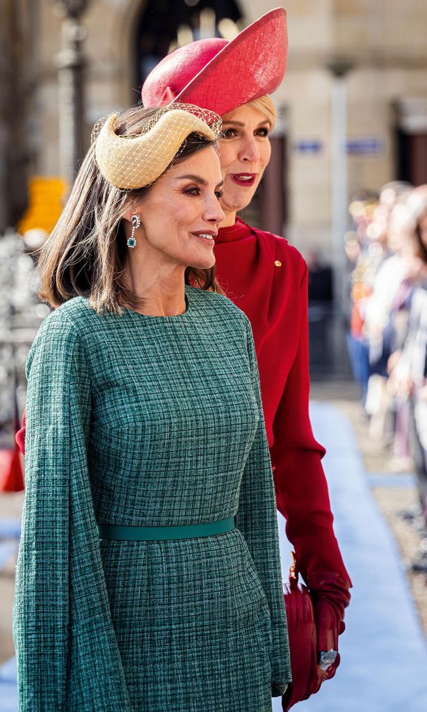 Minutos después, los cuatro se dirigieron al Palacio Real, rodeado de tulipanes rojos y amarillos, donde se celebró una reunión de las delegaciones en el salón del trono, mientras los focos volvían a girar hacia las dos Reinas, quienes, fieles a su estilo, hicieron una primera aparición con dos looks muy diferentes: doña Letizia, con un vestido de tweed verde y tocado en onda, de Balel, y Máxima, con un conjunto rojo oscuro, de Natan, y un sombrero de ala ancha.