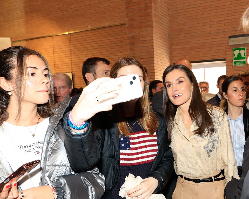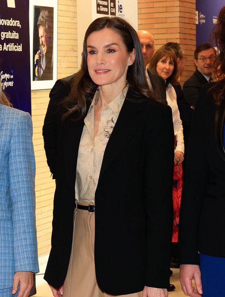 Para esta cita, la reina Letizia ha llevado un pantalón de cuero beige, una prenda de tendencia que vuelve a recuperar su imagen más cañera y atrevida, como la que nos mostró en la inauguración de la Feria Internacional de Arte Contemporáneo ARCO. Ha combinado la prenda con una blusa texturizada y con estampado de flores en una gama cromática.