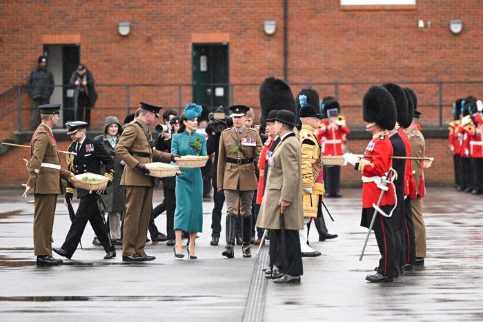 La princesa de Gales ha estado repartiendo ramitas de tréboles a los oficiales, quienes a su vez las han distribuido entre sus filas. Se trata de una tradición que comenzó en el año 1901 con la reina Alexandra, esposa de Eduardo VII, que fue la primera en asistir a este tipo de actos. Más tarde, fue la Reina madre la que retomó esta tradición que se ha mantenido.Kate Middleton también ha colocado un ramillete en el collar de la mascota del regimiento, un perro llamado Turlough Mor al que se le conoce también con el nombre de Seamus que llegó a finales de 2020 al citado regimiento tras pasar un mes con un guía en el Centro de Entrenamiento del Cuerpo Veterinario del Ejército Real.