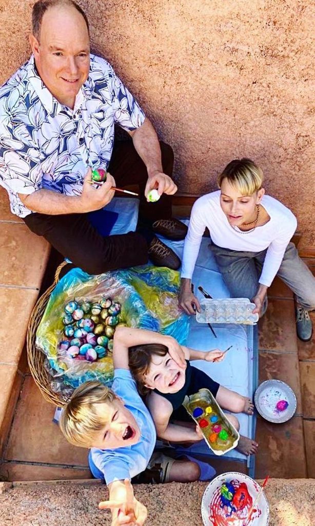 Charlene compartió la imagen más ‘real’ de la familia: él, con camisa hawaiana, y ella, con vaqueros, pintando huevos de Pascua con sus hijos.