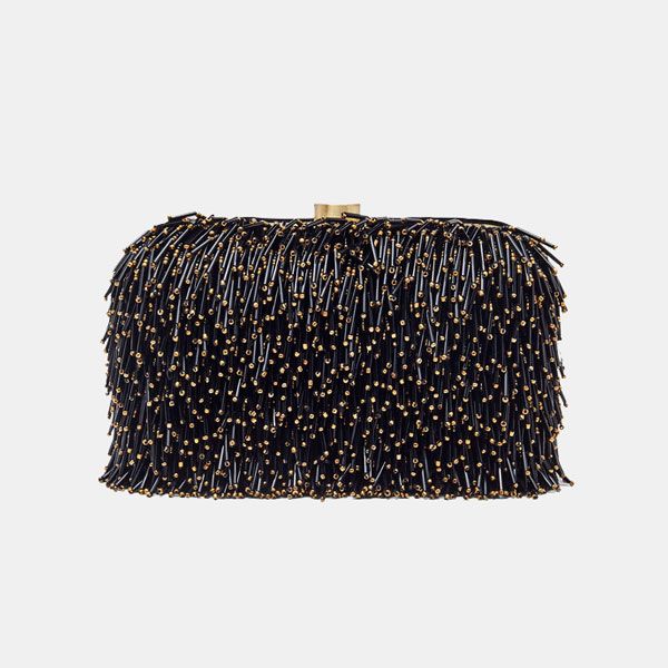 ¿Quieres salirte de lo convencional? Este clutch te lo pone muy fácil gracias a su diseño de flecos creados a partir de abalorios que le aportan un acabado brillante muy similar al efecto de las lentejuelas. Un bolso de fiesta en tonos negros y dorados con asa extraíble para que puedas colgarlo cuando te apetezca. Además, solo incluye las aplicaciones de abalorios en la parte frontal, por lo que no corres peligro de que se enganche con tus prendas y cree enganchones o roturas inesperadas.