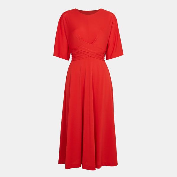 En un corte muy similar al del vestido de Kate, con cuello cerrado, mangas abullonadas, ajuste en la cintura, largo por debajo de las rodillas y falda evasé, este modelo de Forever New es perfecto para tus citas más especiales gracias a su tejido satinado. Un modelo con detalles asimétricos y drapeados en el pecho, que consiguen equilibrar los volúmenes y añadir un extra de tendencia. Además, puedes comprarlo rebajado de 172,99 a 52,49 euros.