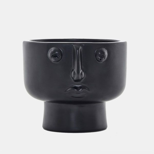 Cualquier oportunidad es buena para añadir una nota de original a la decoración de tu casa y este macetero de barro cocido es una de las formas más elegantes de hacerlo. De forma redondeada y en color negro, presenta una forma de cara en reliege en la parte frontal. Un detalle que resaltará mucho más cuando añadas una maceta en su interior, cuya planta funcionará como el pelo de la figura.