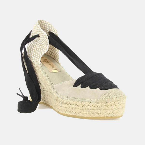 Las clásicas bicolor de Vidorreta siguen siendo unas de las más buscadas cuando llega el buen tiempo y son precisamente estas: unas alpargatas de cuña de yute, con piel caprina en ante color beige y lazada negra. El yute de su cuña es natural y mide un total de 7 centímetro y 2,5 en la plataforma. Clásicas, cómodas y muy, muy en tendencia pasen los años que pasen.