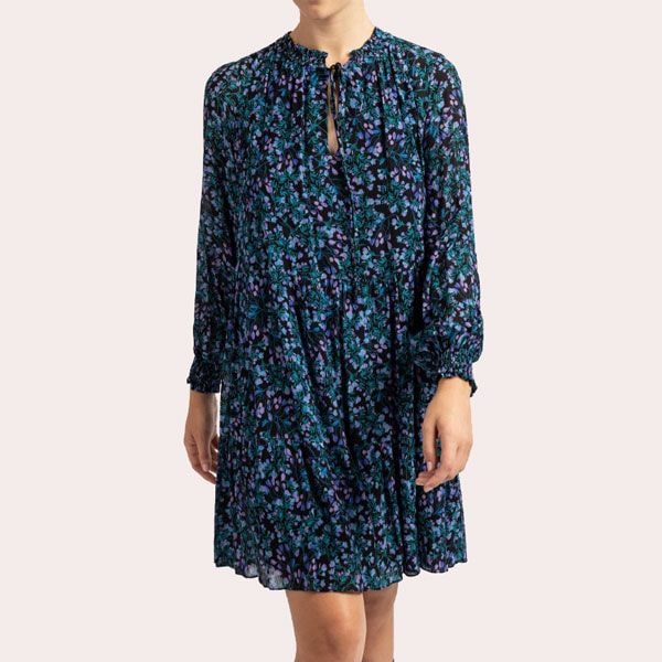 Da igual la estación en la que nos encontremos, los vestidos de flores (en diferentes tejidos y larguras) no pueden faltar en tu armario. Y Unisa tiene un modelo al que no te vas a poder resistir. Se trata de este diseño de manga larga, cuello fruncido con lazada, puños ajustados y largo hasta la rodilla. Una prenda de corte recto con un ligero acampanado y falsos volantes en la falda cuya combinación de tonos verdes, azules y lavanda te permitirá encajarlo en infinidad de estilismos.