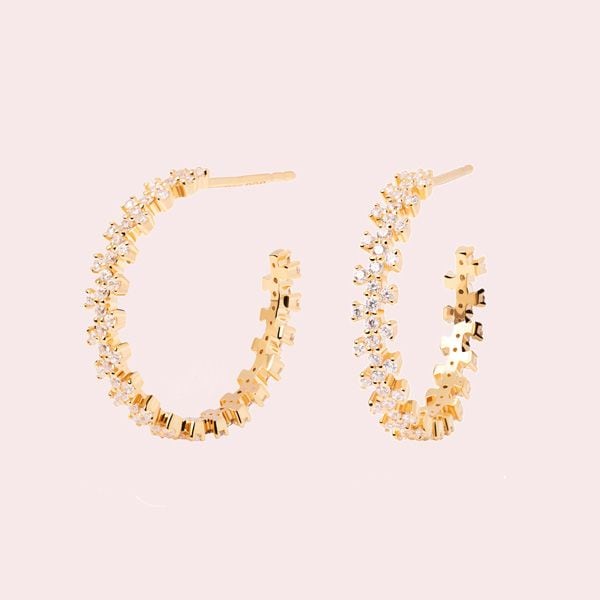 Están fabricados con plata de ley y un baño de oro de 18 quilates, y rematados con una fila de circonitas blancas. Aunque, en este caso, mantienen el diseño clásico de los aros con cierre de click y un tamaño más pequeño de 15 milímetros de diámetro.