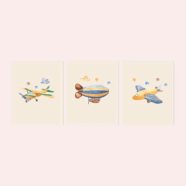 Estos cuadros infantiles no necesitan ser enmarcados, porque la impresión en tela de lienzo (siempre de primera calidad en un gramaje de 320 g/m²) viene tensado en un bastidor de madera de pino con un grosor de 1,2 centímetros. Son tres imágenes diferentes pero a juego, con aviones como protagonistas.
