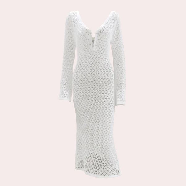 Se trata del modelo Kayleigh de la firma Meshki, una pieza de crochet en color blanco que destaca por su corte sirena que marca las curvas, sus mangas acampanadas extralargas y su pronunciado escote en pico con abertura. Una apuesta sensual y muy elegante con la que sumarse al tejido de tendencia que arrasa este verano. Sin embargo, actualmente se encuentra agotado en casi todas las tallas.