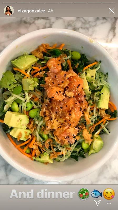 Otro secreto sobre la dieta de Eiza, es que contrario a lo que pudieras pensar, suele cenar mayor cantidad que en el resto de sus comidas. De hecho, el segundo platillo que propone es una ensalada mucho más generosa que la anterior. Contiene aguacate y salmón –alimentos con alto contenido en grasas saludables– zanahoria, pepino, edamames, kale (col rizada) y macroalga (seaweed).