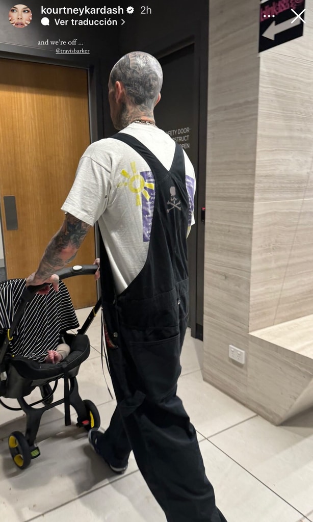 Aunque la ajetreada vida de mamá demanda looks cómodos y prácticos para el diario, Kourtney compartió en sus redes un carrusel de fotos donde muestra un look más chic para uno de los conciertos de Travis, mientras que muestra la realidad de ser mamá: posando con su carriola en una playera gráfica oversized, mules negros de punta y una diadema muy cool para el cabello.
