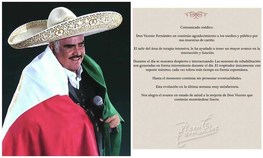 Sus palabras confirman las buenas noticias que la familia compartió este miércoles en las redes sociales del cantante, en donde se reporta de manera oficial cómo avanza su situación. “El salir del área de terapia intensiva, le ha ayudado a tener un mayor avance en la interacción y función”. Los familiares de Don Vicente no dejaron de agradecer la atención y el cariño del público que se mantiene al tanto desde el día que llegó de urgencia a un hospital en Jalisco, México, luego de una caída en su propio hogar.