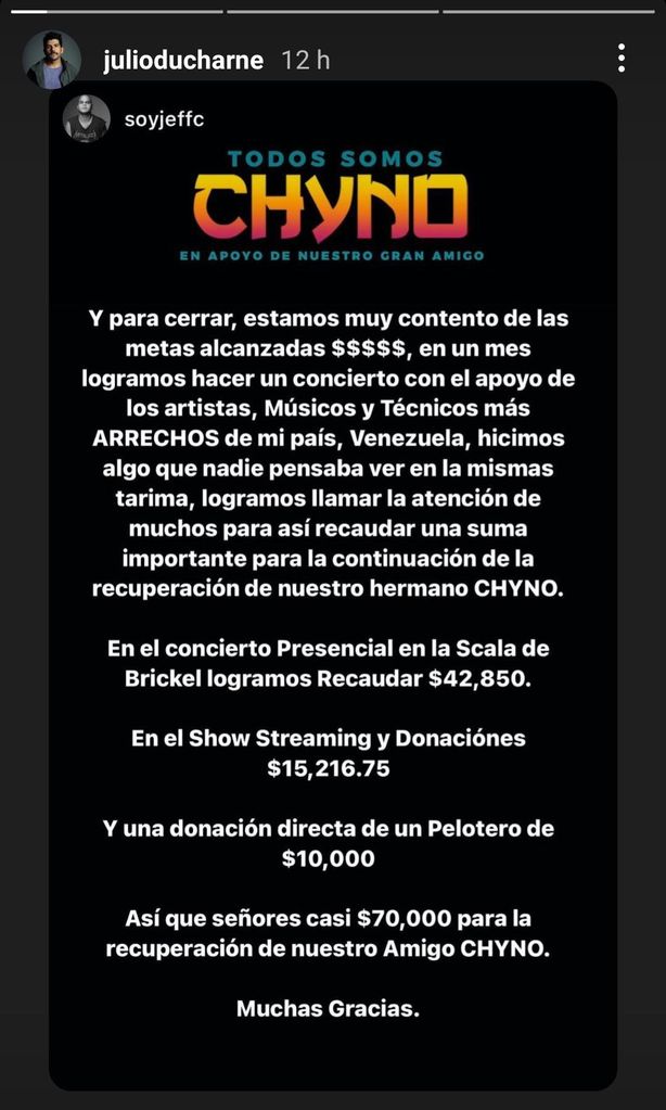 Jeff Cárdenas, productor y dueño de NoxoStudios reveló las cantidades exactas que se recaudaron en el concierto a beneficio. En su mensaje, se lee lo siguiente: “Estamos muy contentos de las metasalcanzadas $$$, en un mes logramos hacer un concierto con el apoyo de los artistas, músicos y técnicos más arrechos de mi país, Venezuela, hicimos algo que nadie pensaba ver en la misma tarima, logramos llamar la atención de muchos para así recaudar una suma importante para la continuación de la recuperación de nuestro hermano Chyno”.