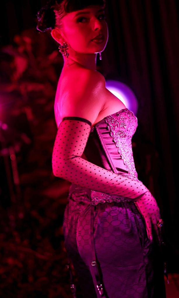 Si bien este espectáculo se grabó semanas atrás, fue hasta ahora en su lanzamiento que el público pudo ver a detalle el look de impacto de la hija de Pepe Aguilar. Ángela usó un conjunto de la nueva colección de ‘Riri’, en el que el protagonista fue sin duda el bustier de satín negro con detalles de encaje morado. Además de esta pieza, la intérprete de Llorona usó únos pantalones de pijama negros, unos guantes largos transparentes, y unos tacones fucsias.
