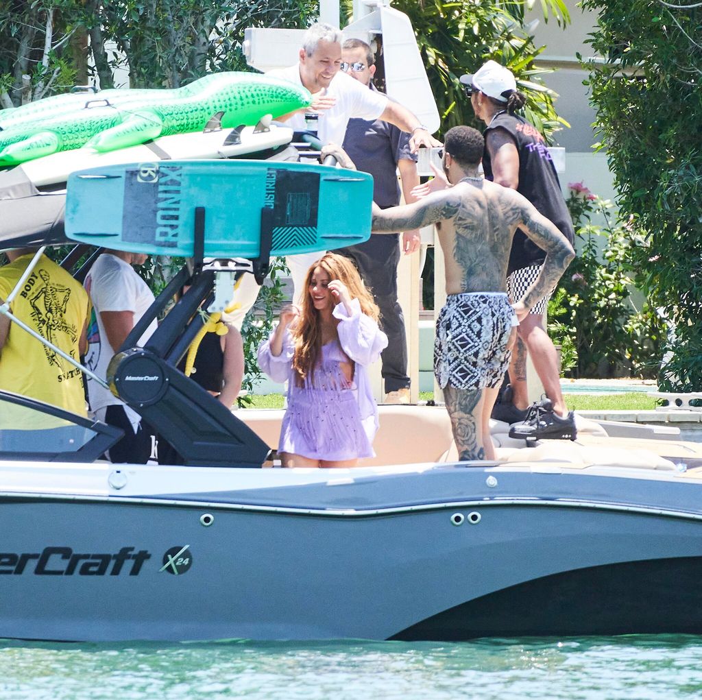 La cantante colombiana y el piloto británico salieron a navegar por Miami Beach con un grupo de amigos