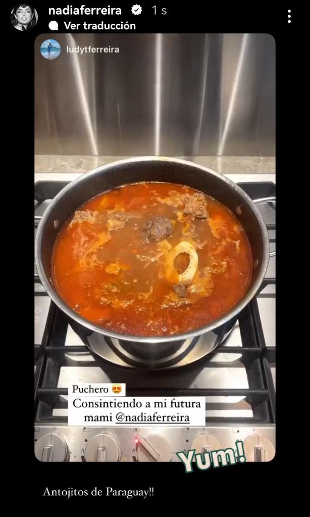 A través de sus redes sociales, la modelo de 24 años replicó la foto que su madre compartió en sus redes sociales, las cuales son privadas. En la foto, se aprecia el platillo típico sobre la estufa y junto a este, la señora Ludy escribió: “Consintiendo a mi futura mami”. Junto a la foto, Nadia comentó; “Antojitos de Paraguay”.