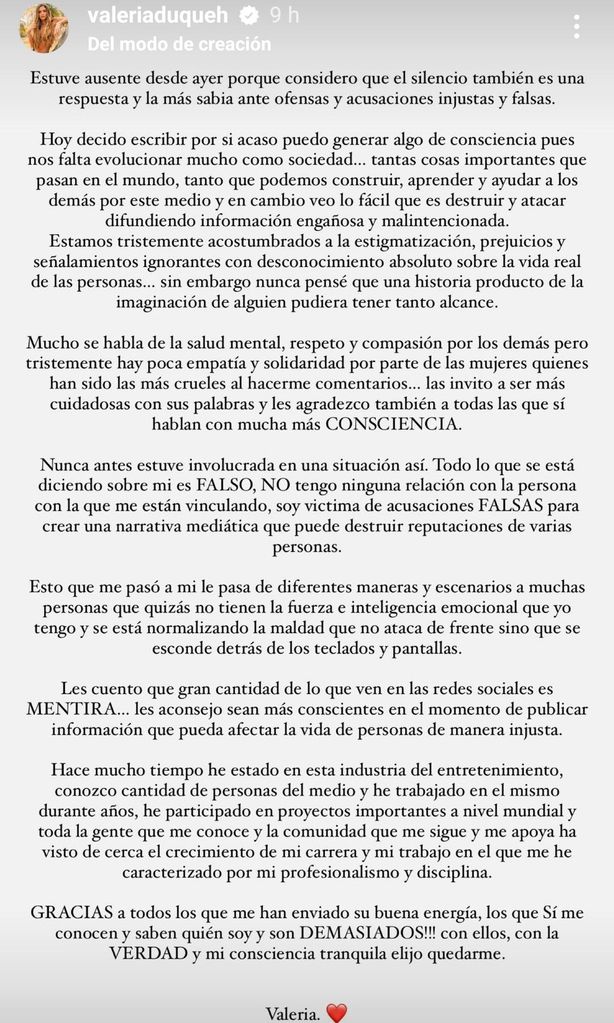 Valeria tomó sus historias de Instagram para compartir un extenso comunicado respecto a la situación en la que se ha visto envuelta. “Estuve ausente desde ayer porque considero que el silencio también es una respuesta y la más sabia ante ofensas y acusaciones injustas y falsas”, inició su mensaje.