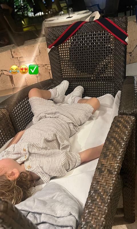 Entre las fotos que compartió la modelo, hubo una muy simpática que hizo suspirar a muchos, en especial a quienes han vivido en carne propia la paternidad. Y es que el pequeño se quedó dormido en una salida a un restaurante con sus padres, y ellos tuvieron que improvisar una cama para su pequeño juntando dos sillas.