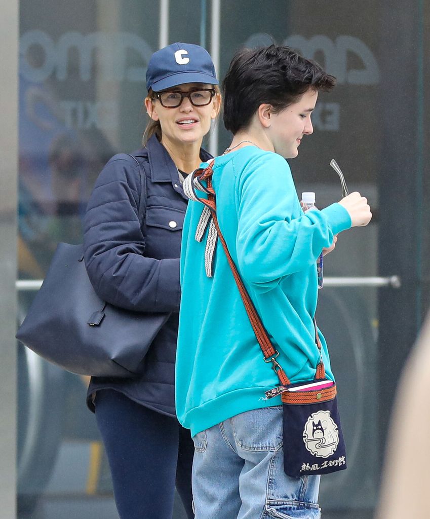 Garner se dejó ver con un par de mallas deportivas en color azul marino, calzado deportivo y un chaqueta oscura, demás de unas gafas y una gorra, quizá para ir en bajo perfil a esta salida al cine con los chicos, y brindar un poco de normalidad a su estatus como celebridad, para así pasar desapercibida.