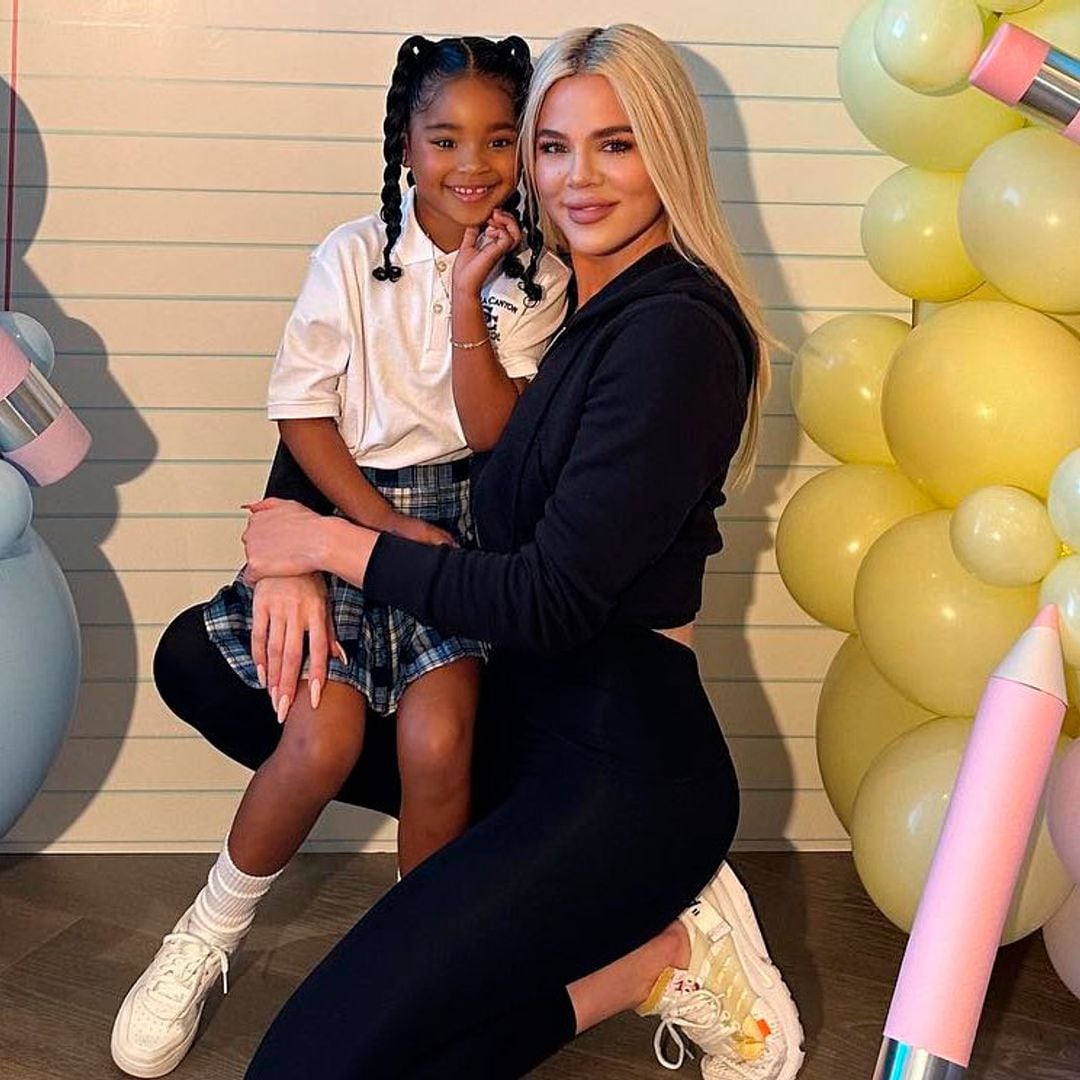 True estaba muy contenta con su fiesta, y en su outfit destacó una gran cadena de platino con su nombre en diamantes.