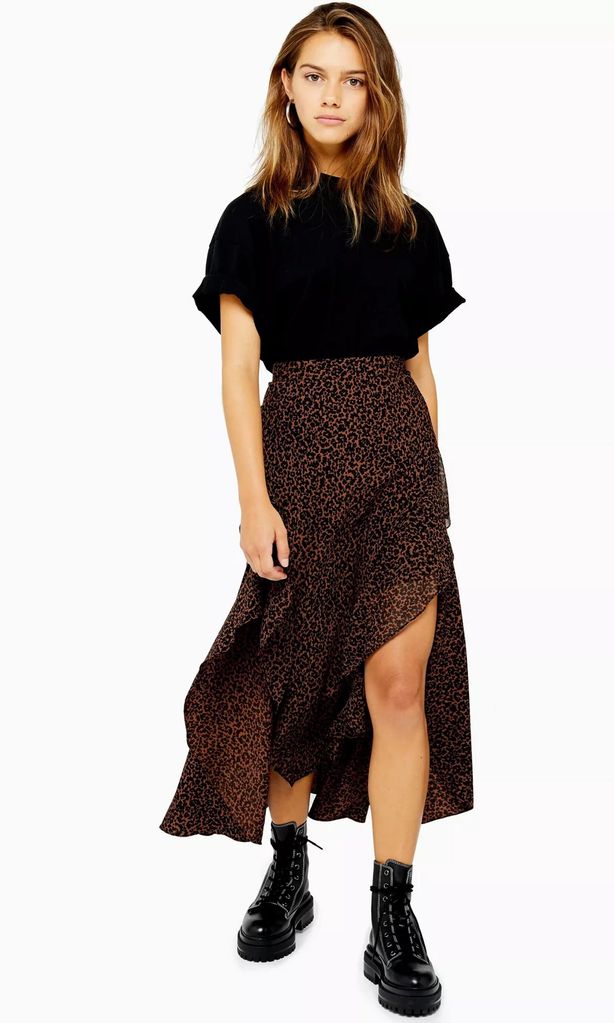 O inclínate por una textura lisa pero con el estampado de base marrón oscura como el de Kate con esta falda larga con aberturas frontales. Topshop ($48).