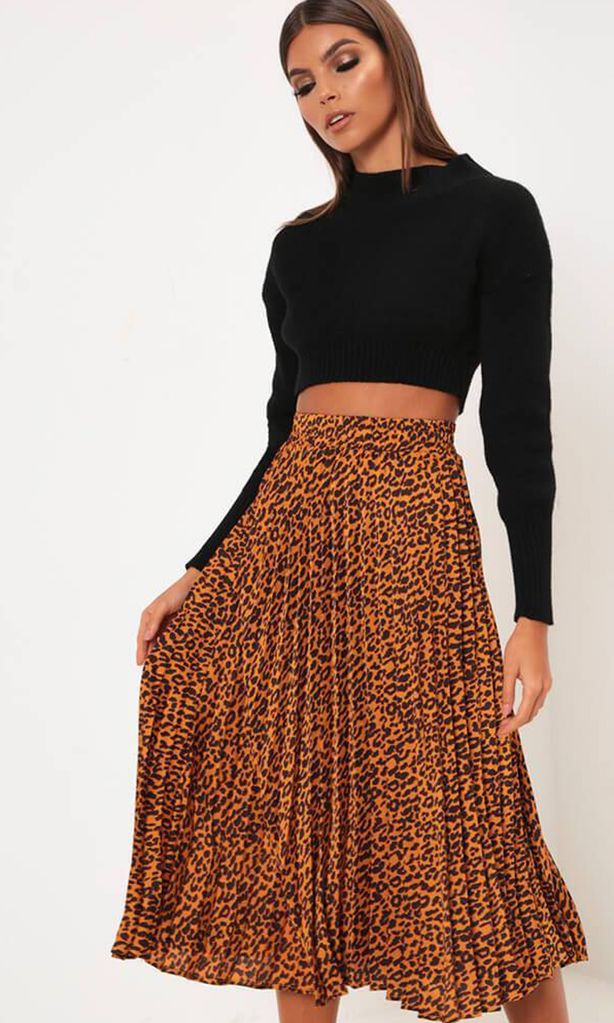 El doble tono apareció también cuando se quitó el abrigo, aunque los involucrados esta vez fueron el marrón y el negro, dos colores que, para muchas, nunca pueden ir juntos. ¿La forma efectista para hacerlo? Con una falda en animal print de leopardo, plisada, midi y fluída de Zara —una marca low cost por la que ha mostrado mucho interés—, combinada con un elegante y sencillo sweater negro y botas a juego.