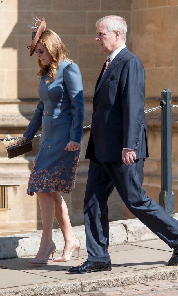 En la preciosa capilla de St. George celebra la familia real inglesa celebra la Pascua. Sobre estas lineas vemos a Beatriz de York con un vestido azul con detalles marrones, que combina a su vez con un tocado en los mismos tonos y unos zapatos de salón en tonos neutros.