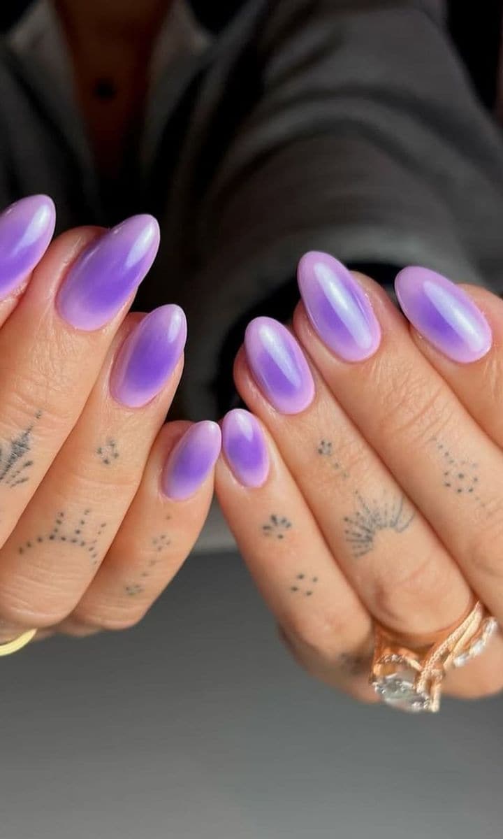 Pearly, iridescent lavender nails offer a hypnotic shine that shifts with the light. This chrome effect feels futuristic and sophisticated—a fresh, modern twist on the classic lavender manicure.