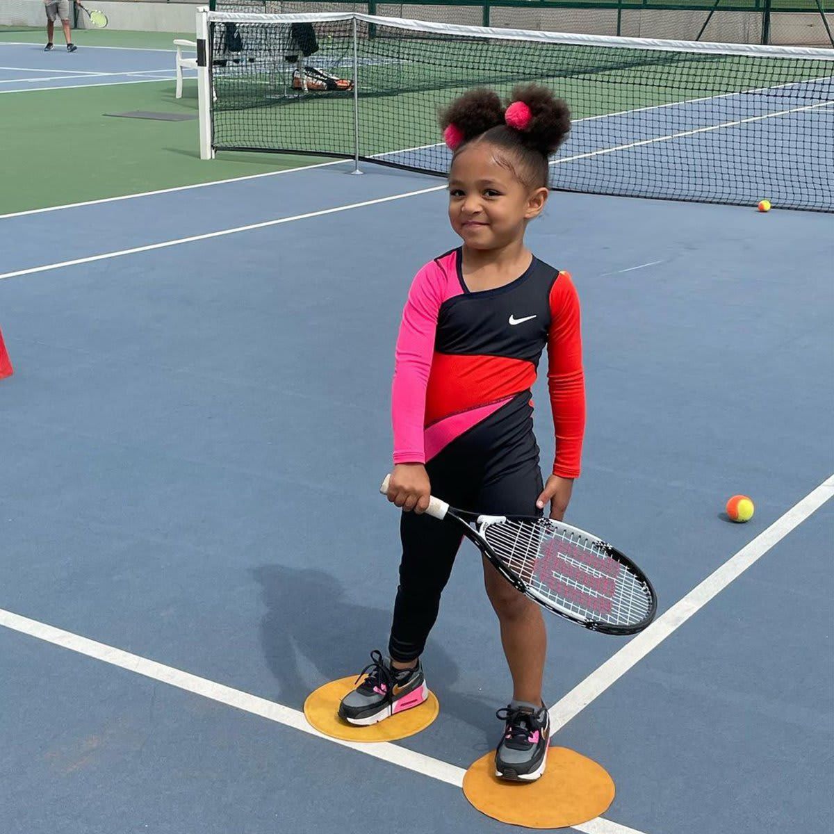 Following in her mom’s footsteps during a recent tennis session, the toddler sported a miniature version of the iconic, one-legged catsuit her mom wore at the Australian Open earlier this year.
