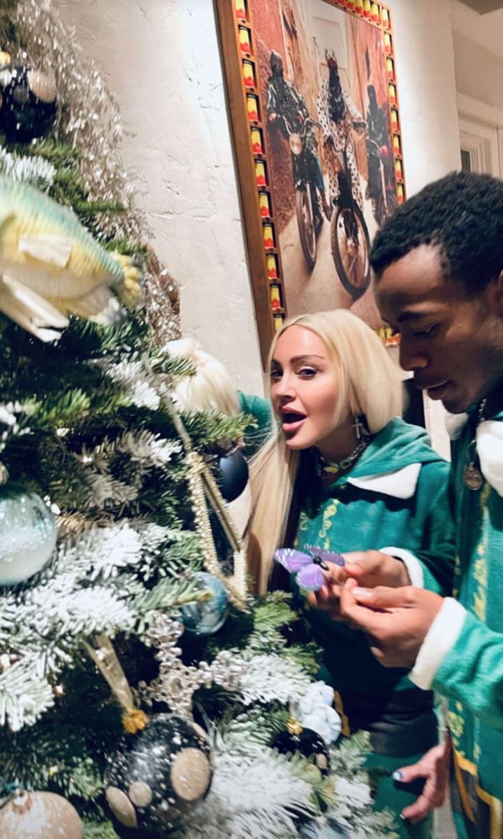 Madonna reunited some of her loved ones around the Christmas tree to decorate it in festive attire. Four of her kids, David, Mercy James, and twins Stella and Estere, and the singer’s boyfriend, Ahlamalik Williams, dressed in matching elf pajamas to finish the holiday decorations as a family.