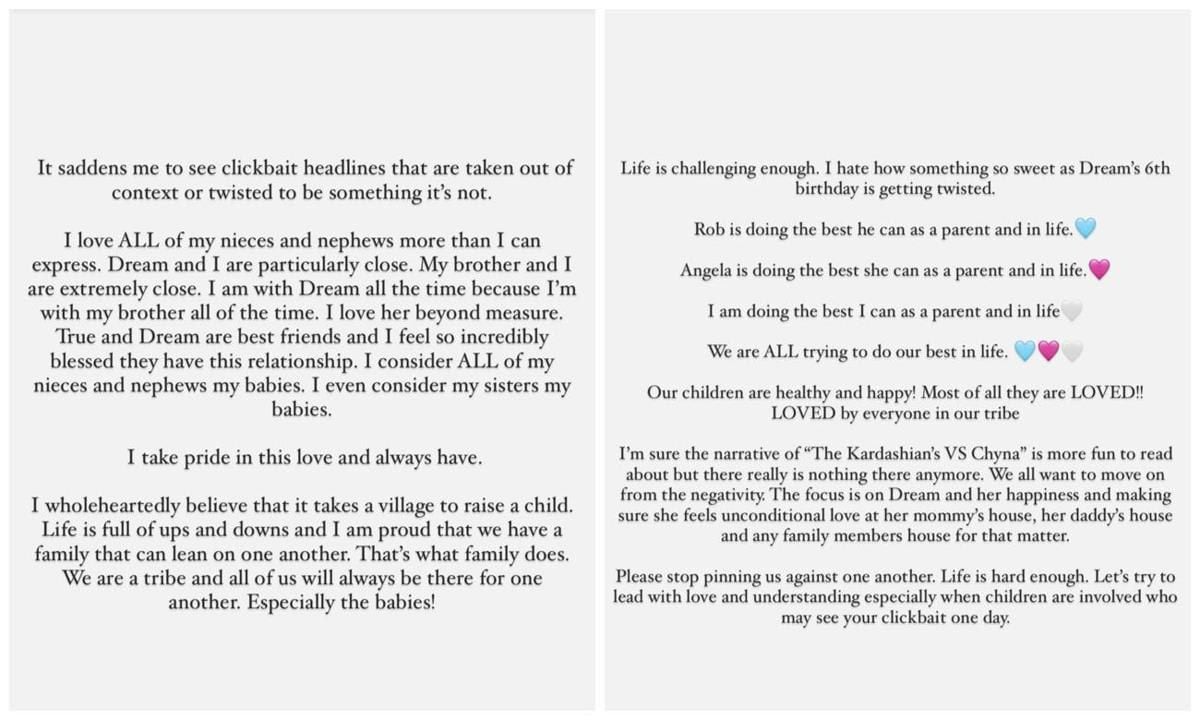 Even if she is helping out take care of dream, she reminded followers that there is nothing wrong with helping your family, “I wholeheartedly believe that it takes a village to raise a child,” she said, adding that Chyna, Rob, and herself are doing the best they can as “parents and in life.”