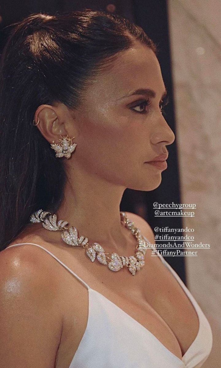 The exquisite pieces from Tiffany & Co.‘s “Diamonds and Wonders” collection effortlessly enhanced Antonela’s look. Among them were a platinum, gold leaf-shaped diamond necklace and matching diamond floral design earrings, which she paired with a bracelet and rings all from Tiffany & Co.’s Schlumberger collection. These stunning jewels became the true stars of her outfit and complemented her look while showcasing the brand’s unmistakable touch of elegance.