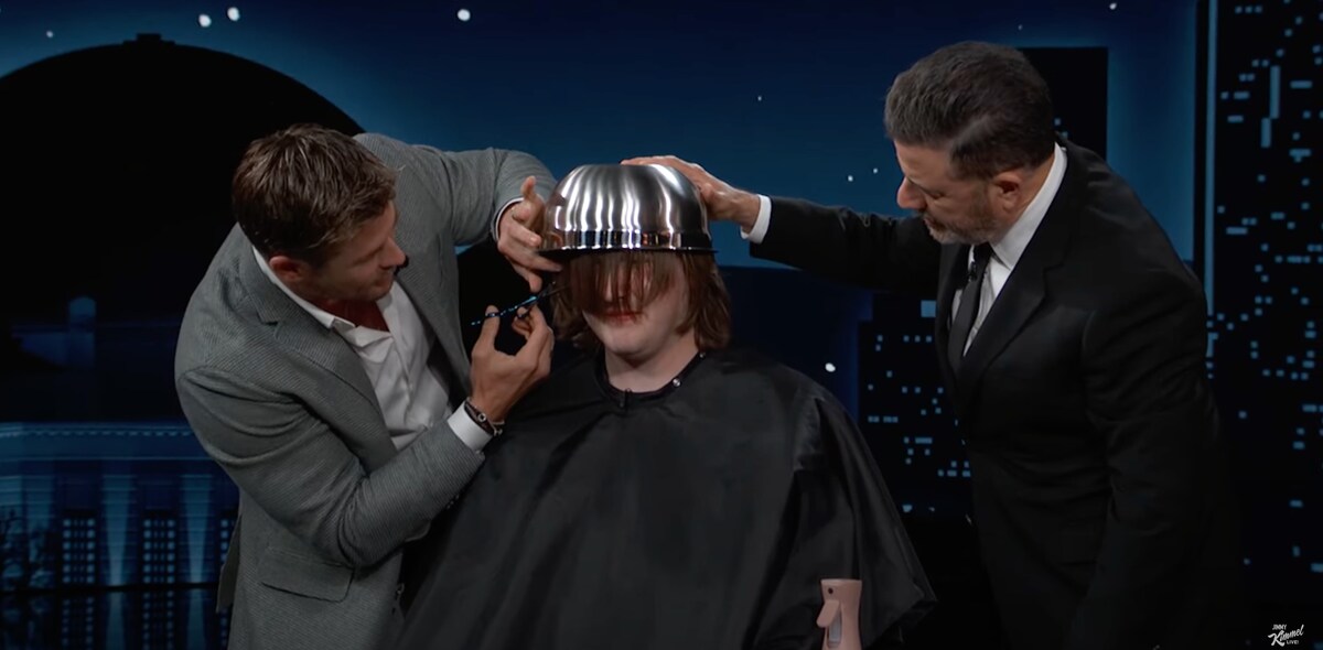 Shortly after, Chris and Jimmy brought a volunteer named Liam onto the stage to demonstrate the haircut process. Hemsworth dampened Liam's hair with a spray bottle and then used a metal bowl as a guide to trim Liam's long locks.