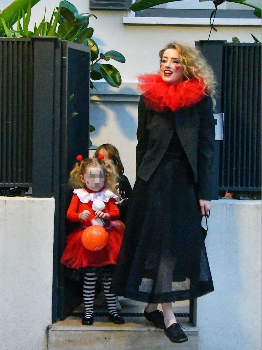 For Halloween, Amber and Oonagh celebrated in adorable matching costumes, with Amber dressing up as a pagliacci clown. She kept it simple and stylish with a black ensemble likely from her closet, a red tulle collar, subtle white makeup, fake eyelashes going in opposite directions, with red hearts on her cheeks and lipstick.