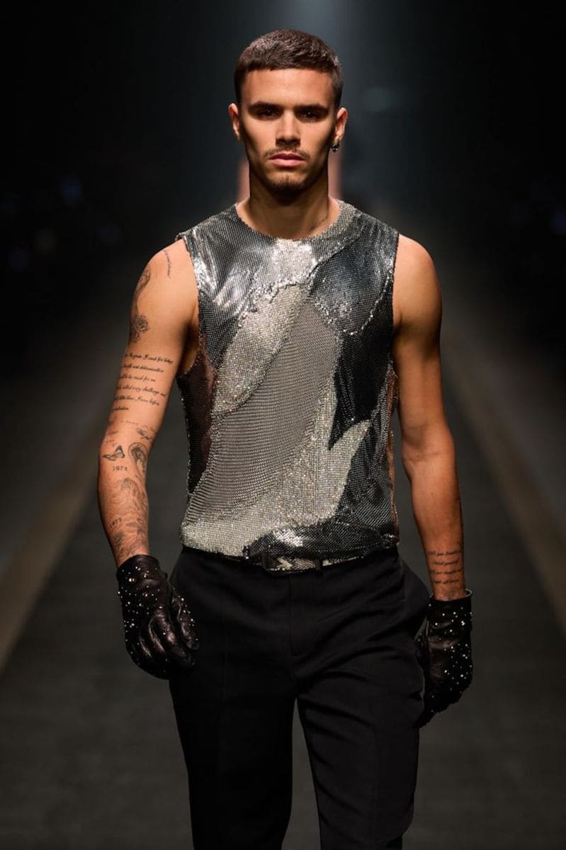 Donatella Versace, known for selecting talent that embodies the brand’s rebellious and glamorous spirit, personally chose Romeo for this show. “He has a unique energy and an incredible presence,” the designer said backstage after the event.