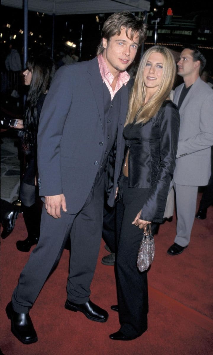 It’s the year 2000 and the then-couple dressed up, matching in head-to-toe black for the American Film Institute honoring Harrison Ford. Unlike today’s affinity with tailored and slim-fit trousers, Brad’s early 2000s suit continued featuring baggy pants.