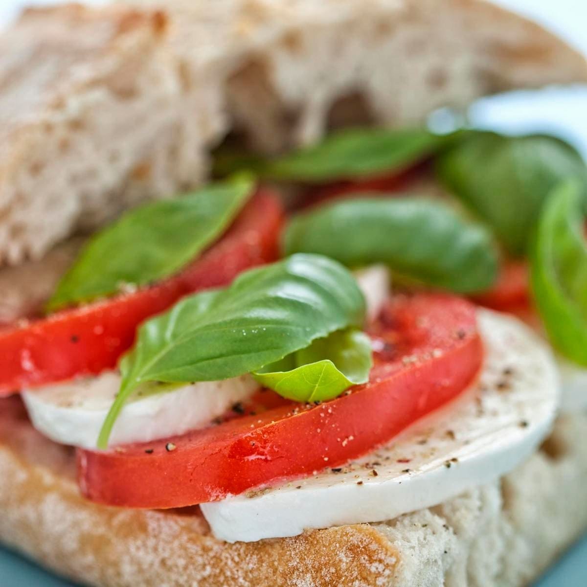 Focaccia or ciabatta bread, sliced in half and cut into 6“ in length, per sandwich. Add two slices of mozzarella cheese (sliced from a fresh mozzarella ball), two to three slices of tomatoes, and a handful of arugula. Add a drizzle of extra virgin olive oil and/or balsamic vinegar. Last, add a pinch of salt and a pinch of ground black pepper.