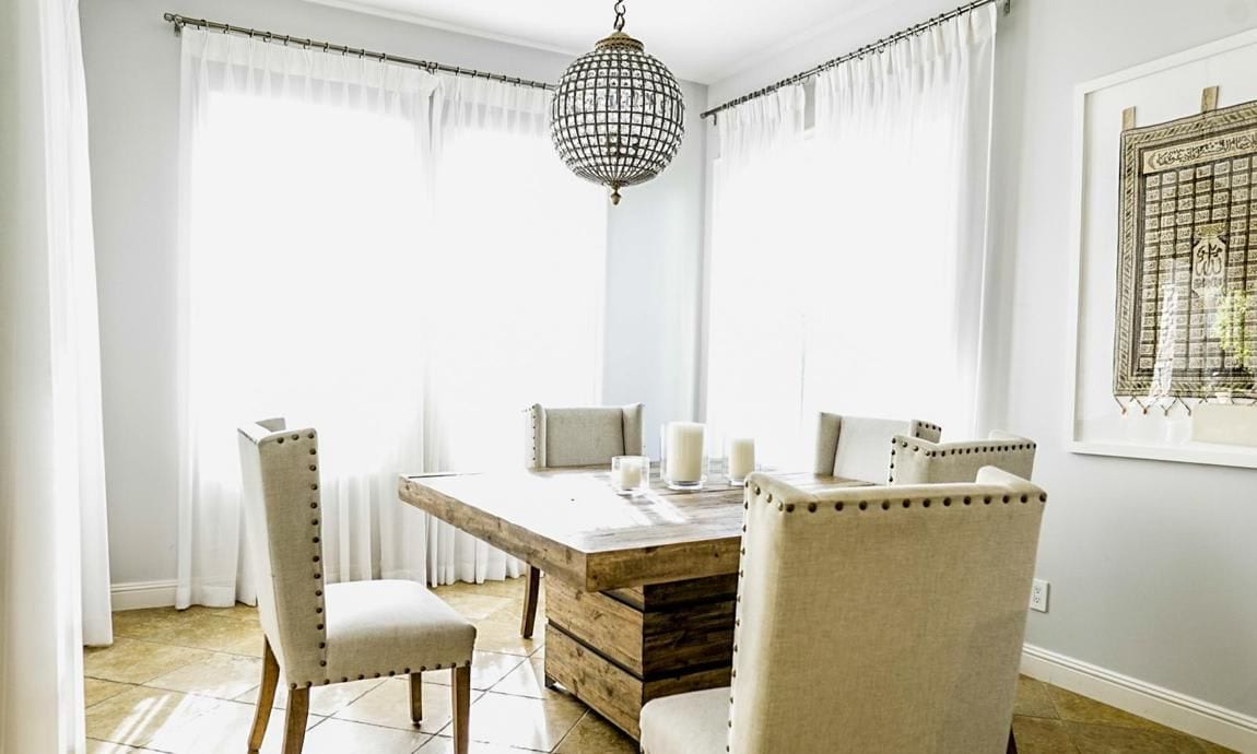 The dining room includes glamorous details like the hanging chandelier and silver-encrusted vases. It also features a colorful portrait of the previous owner French Montana.