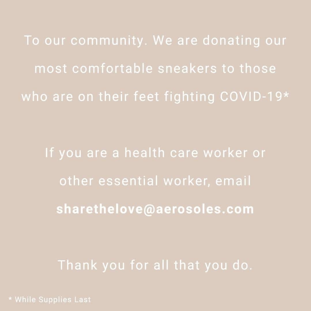 AEROSOLES The comfort-first footwear brand is donating a pair of their most comfortable sneakers to healthcare professionals as well as donating 10% of proceeds from the “Share the Love” collection to Feeding America.