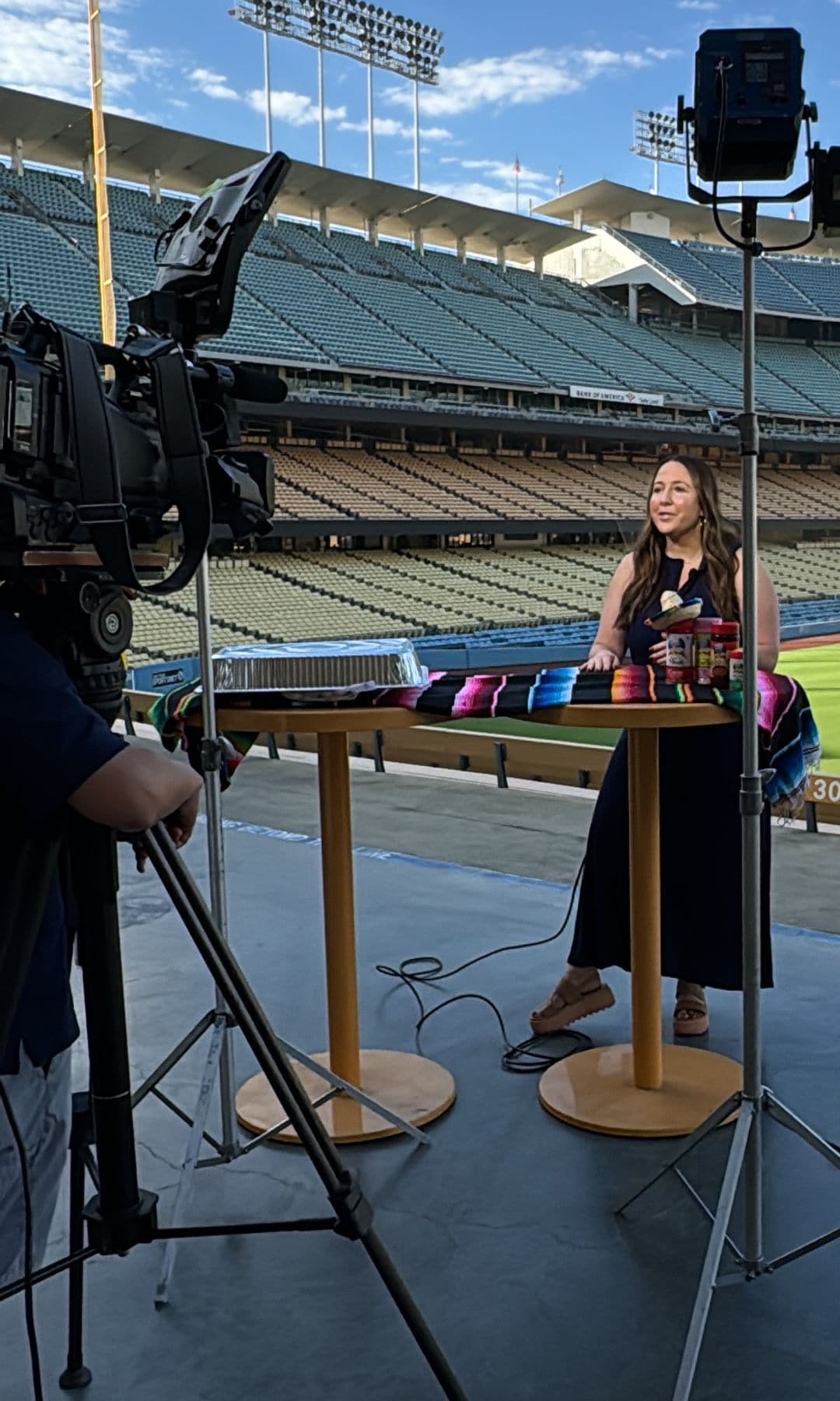 Lauren filming at the L.A. Dodgers Stadium, evangelizing Latino seasonings!