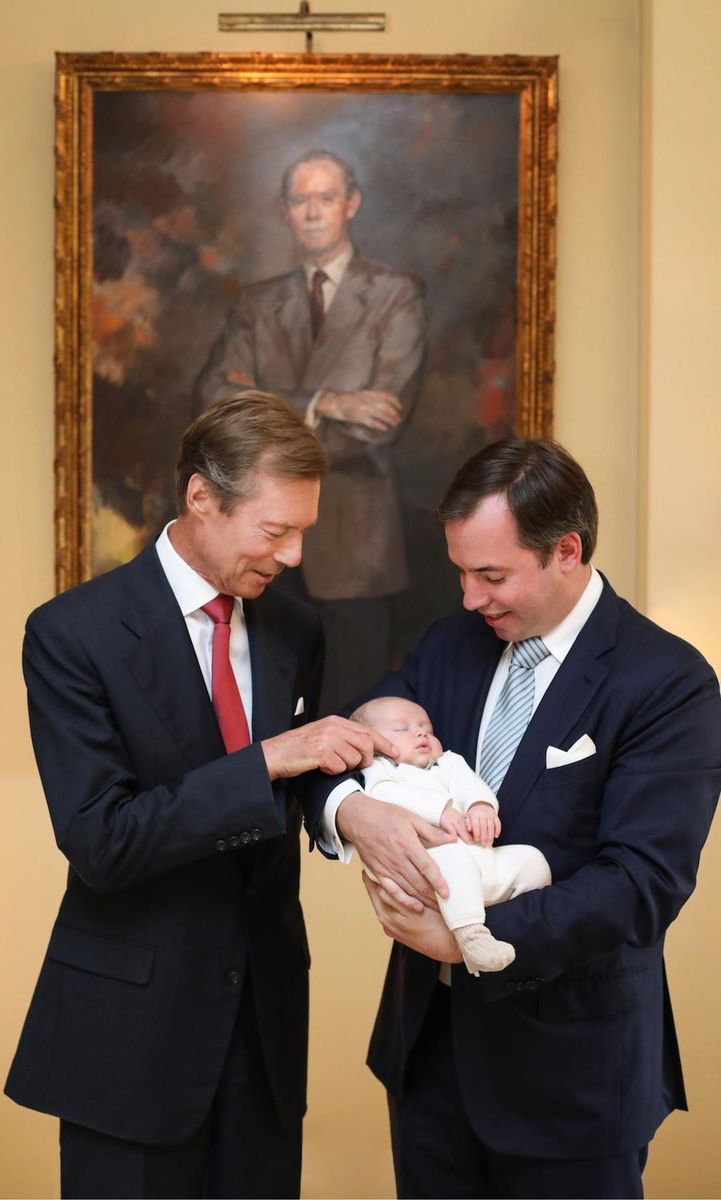 Grand Duke Henri poses with his son Hereditary Grand Duke Guillaume and his fifth grandchild Prince Charles. The nearly two-month-old babe is Guillaume and his wife Hereditary Grand Duchess Stephanie’s first child and now second-in-line to the Luxembourg throne.
