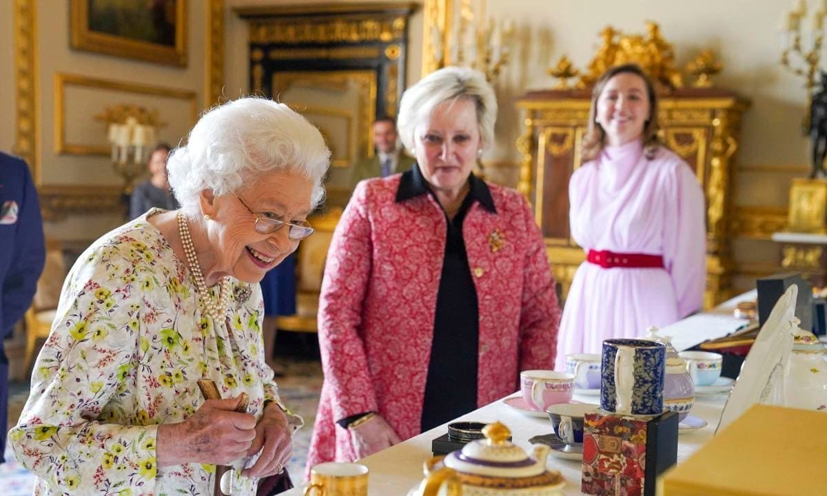 Queen Elizabeth II was photographed speaking with Pamela Harper from British craftwork company at Halcyon Days as she views a display of artifacts to commemorate the company’s 70th anniversary in the White Drawing Room at Windsor Castle. The Queen was admiring a selection of hand-decorated archive enamelware and fine bone china, including their earliest designs from the 1950s.
