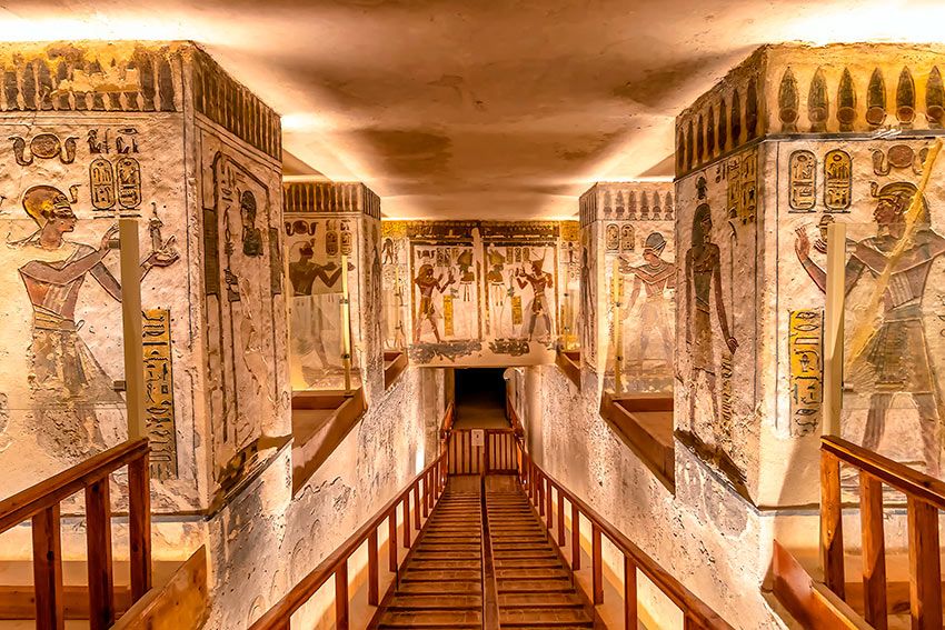En un lugar privilegiado del Valle de los Reyes, esta tumba es uno de los pocos sepulcros utilizados por dos monarcas: Ramsés V y Ramsés VI y una de las mejor conservadas del entorno. Pinturas alusivas al Libro de la Tierra y al díos Ra.