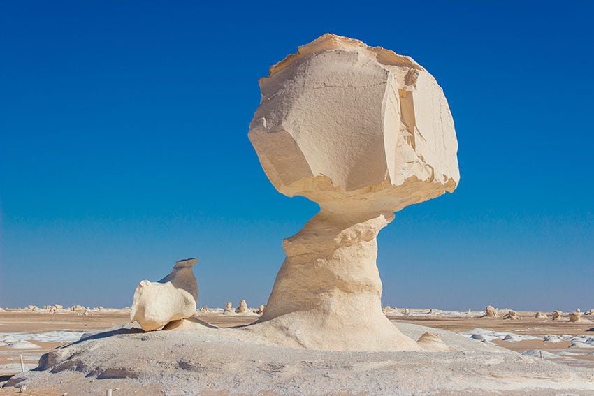 Más arriba, el espectáculo continúa por el más aislado de Farafra, famoso por sus manantiales curativos, y luego por el de Bahariya. Pero antes de llegar a este se descubren las espectaculares formaciones calizas del tramo conocido como el Desierto Blanco. Se trata de unas rarezas geológicas del color de la tiza modeladas a capricho por la erosión de los siglos. Unas con forma de champiñones gigantes, otras de conos de helado no menos descomunal o parecidas a los animales más diversos, su estampa onírica se yergue sobre una llanura lunar que hace millones de años ocupó el lecho del océano.