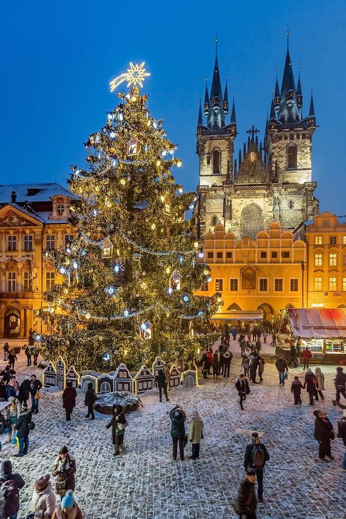Es el más famoso, el que atrae más público y también el más vistoso porque en él se coloca cada año el árbol iluminado más grande de Chequia. No hay un escenario más espectacular que el de esta plaza histórica, enmarcada por magníficas construcciones, como la iglesia de Nuestra Señora en frente del Tyn, la de San Nicolás o la torre del Ayuntamiento viejo, donde se sitúa el Reloj Astronómico que cada hora se pone en movimiento. Hay numerosos lugares donde hacerse la foto, puestos repletos de delicada artesanía, comida para picar, música navideña de fondo, pero para contemplar con perspectiva el conjunto, la torre municipal (10 € o gratis con la Prague Card) ofrece una buena panorámica.